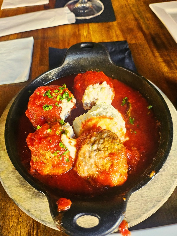 We started with the Meatballs Marinara—four meatballs made with a blend of beef and pork, topped with a tomato-basil sauce and a dollop of creamy, seasoned ricotta cheese.